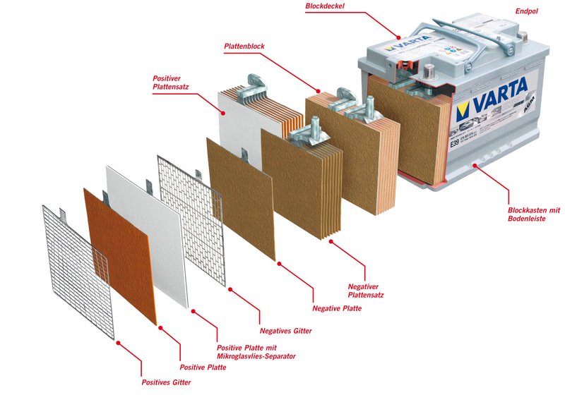 Jede Zelle ist als Plattenblock aufgebaut. Innerhalb eines solchen Blocks wechseln sich positive und negative Platten – die so genannten Elektroden – ab. Autobatterien sind Bleiakkumulatoren, die vor allem aus zwei Stoffen bestehen: Blei und Schwefelsäure. Im Inneren jeder Platte befindet sich ein Gitter aus Blei mit einer härtenden Legierung. Das Gitter nimmt die aktive Masse auf, also das Material, das sich beim Laden und Entladen chemisch verändert. Bei den positiven Elektroden ist es Bleidioxid, bei den negativen Schwammblei. Die Elektroden sind durch Separatoren (zum Beispiel aus porösem Kunststoff mit Glasvlies) getrennt, damit sie sich nicht berühren. Die Separatoren lassen nur den Elektrolyten durch – die Schwefelsäure. Sie befindet sich zwischen den Platten und ermöglicht, dass elektrische Teilchen (Ionen) von einer zur anderen Elektrode fließen. Die sechs Plattenblöcke sitzen in einem Kasten aus Polypropylen, das ist ein sehr stabiler Kunststoff. Oben auf dem Deckel sind die Endpolkappen angebracht, an ihnen werden die elektrischen Anschlüsse des Kraftfahrzeugs (Polklemmen) angeschlossen. Der Pluspol sitzt in der ersten Zelle der Batterie, der Minuspol in der letzten.
